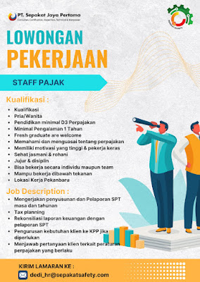 PT. Sepakat Jaya Pertama adalah Perusahaan yang bergerak dibidang Consultan, Certification, Inspection, Technical dan Manpower. Saat ini sedang membutuhkan tenaga kerja untuk ditempatkan pada posisi berikut :STAFF PAJAKDeskripsi Pekerjaan :Mengerjakan penyusunan dan pelaporan SPT masa dan tahunanTax PlanningRekonsiliasi laporan keuangan dengan pelaporan SPTPengurusan kebutuhan klien ke KPP jika